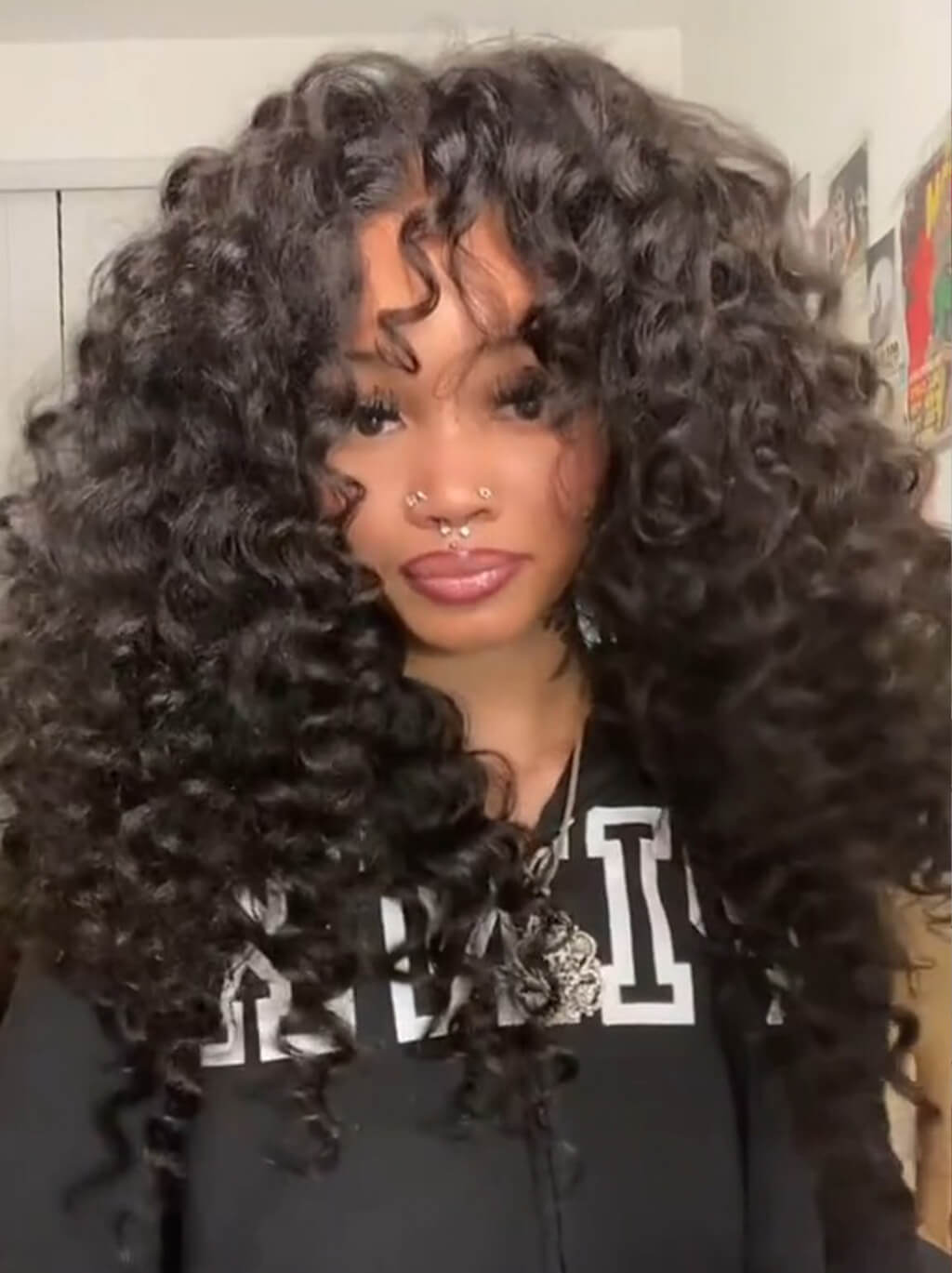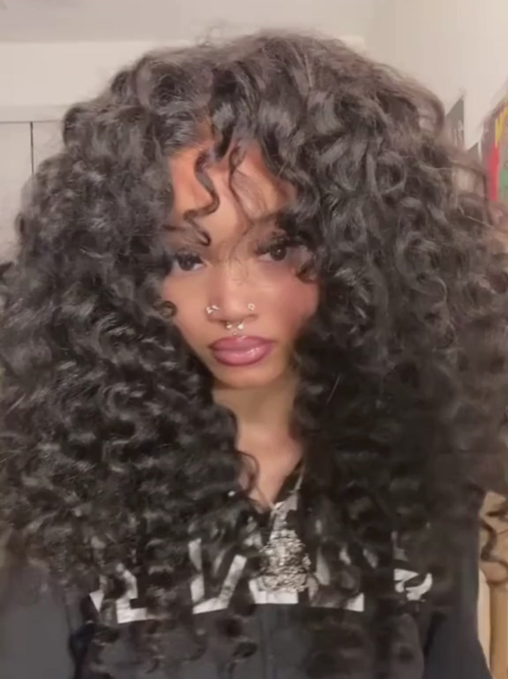 Dorsanee 300 Density Crimped Deep Wave Curls Curtainn Bangs Virgin Human Hair Wigs