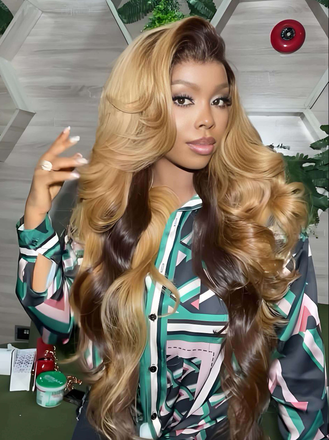 Dorsanee Peekaboo honey Blonde Brown Dark Roots Body Wave 13X4 Lace Front Human Hair Wigs