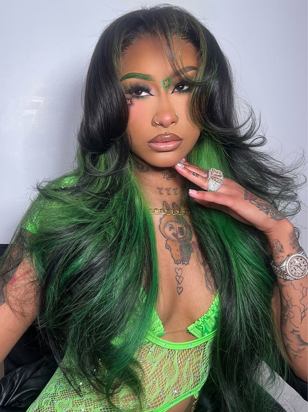 Dorsanee Black With Emerald Green Highlights Face-Framing Luxury Layered Blowout 13x4 Lace Front Human Hair Wigs