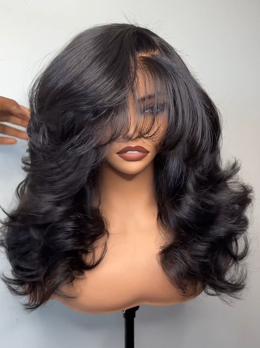 Dorsanee Side Part Layer Cut Straight 13X4 Lace Front Human Hair Wigs With Bangs 250 300 Density