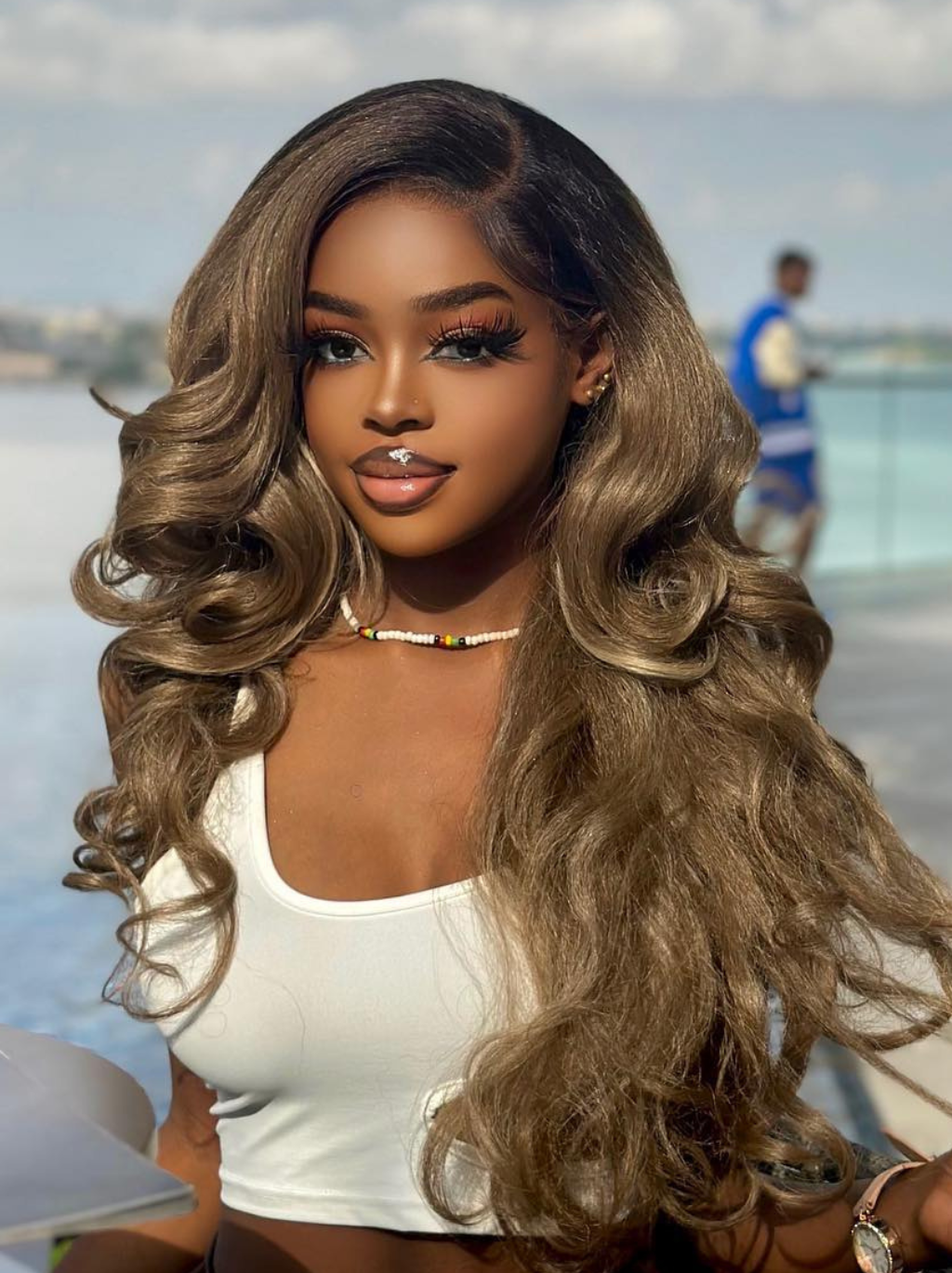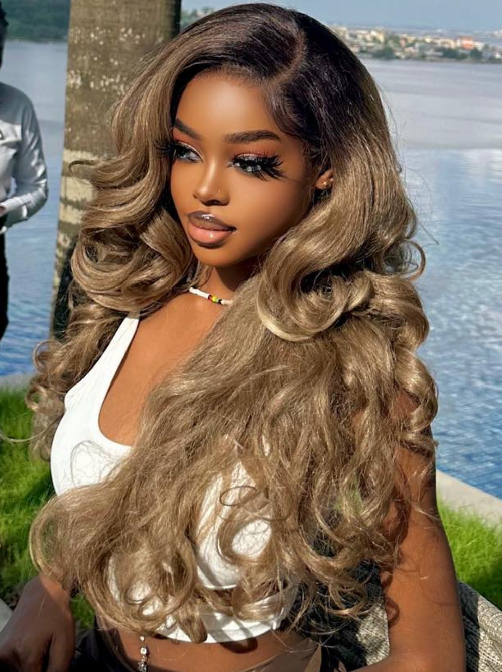 Dorsanee Ash Honey Blonde Brown Body Wave Human Hair Wigs With Black Roots