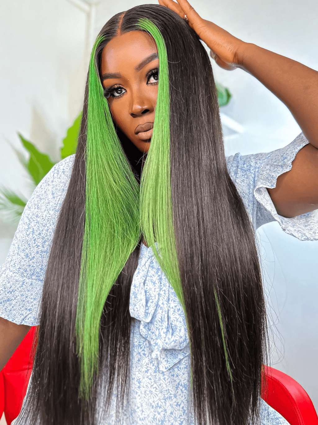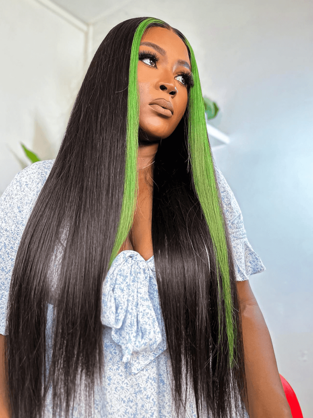 Dorsanee Black With Green Skunk Stripe Highlight Bone Straight Human Hair Wigs
