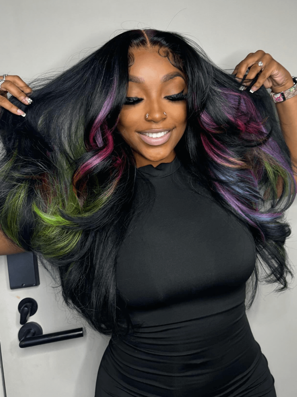 Dorsanee Black with Purple Green Blue Highlight Streaks Virgin Human Hair Wigs