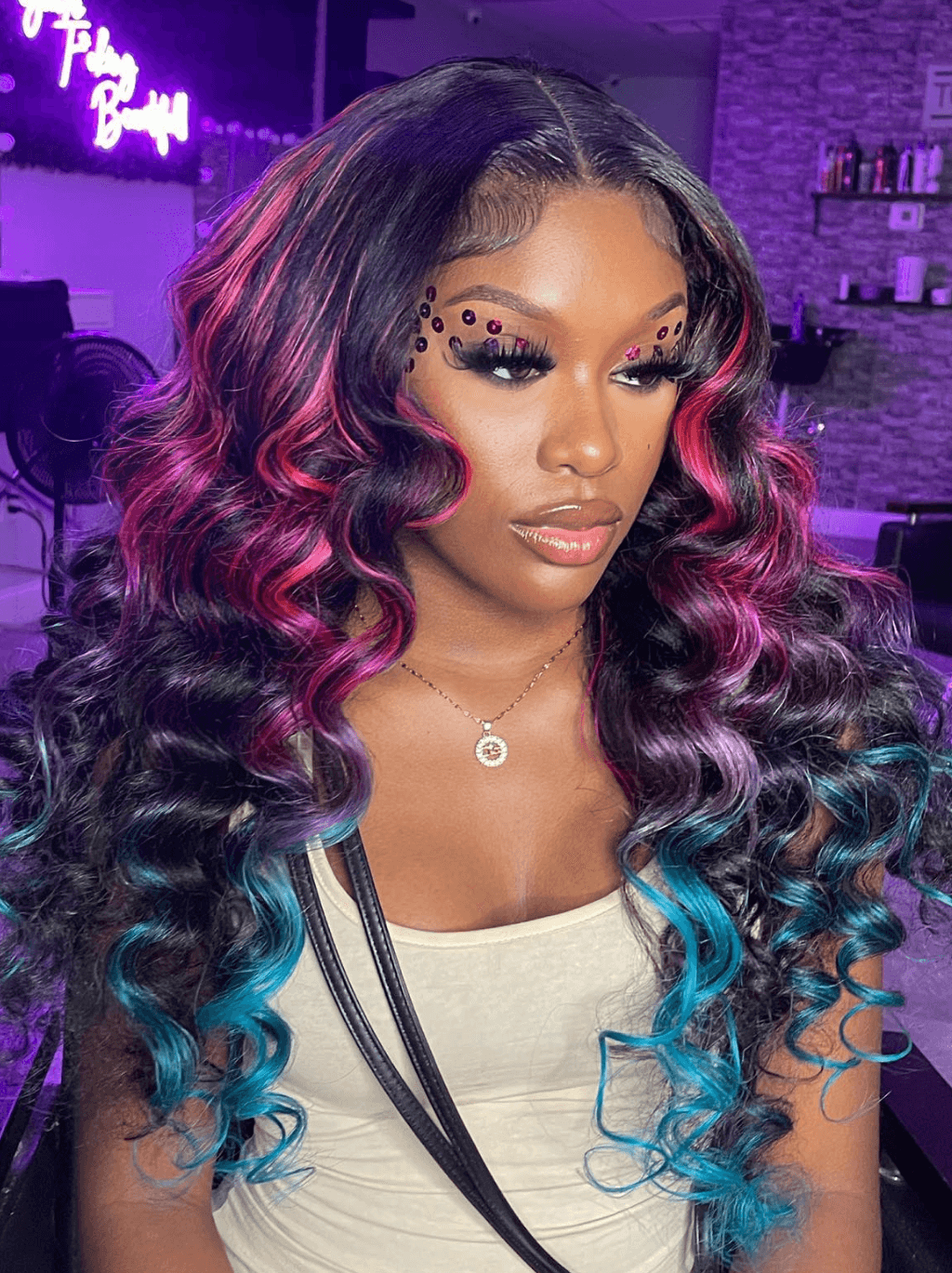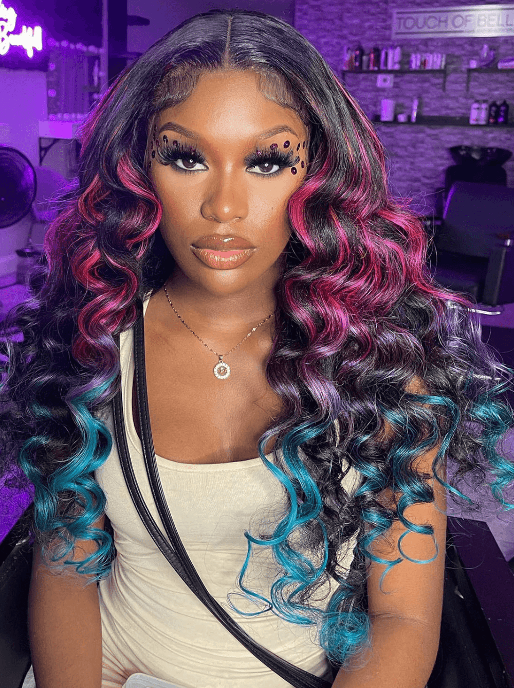 Dorsanee Ombre Black With Red Blue Highlight Body Wave 13x4 Lace Front Hair Wig