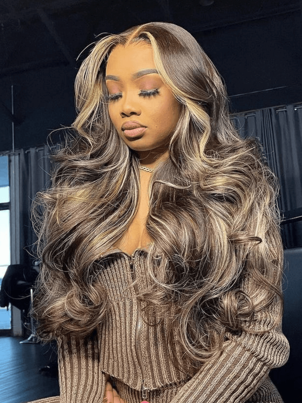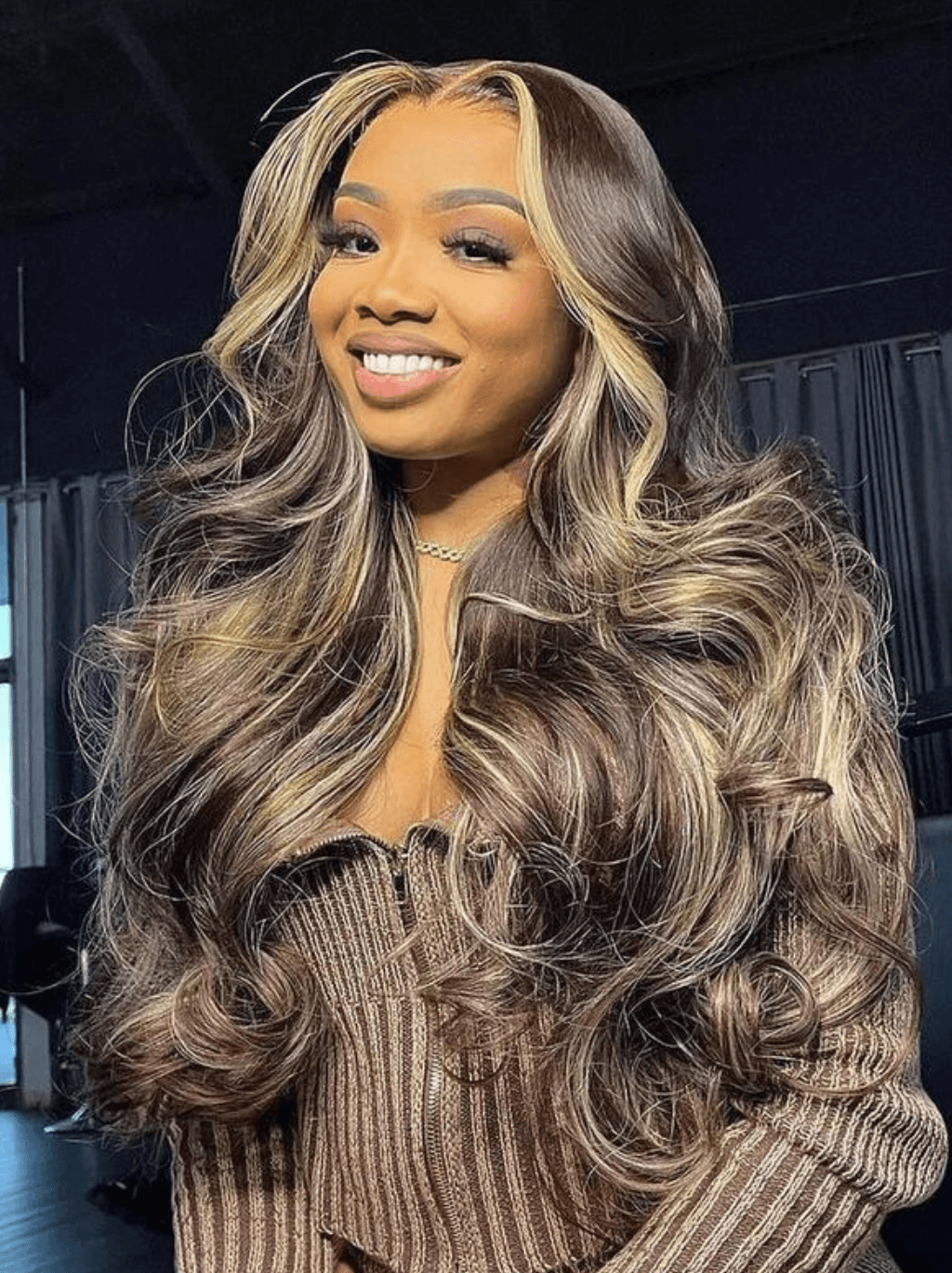 Dorsanee Strawberry Blonde Chocolate Brown Skunk Stripe Highlight Streaks 13x4 Lace Front Human Hair Wigs