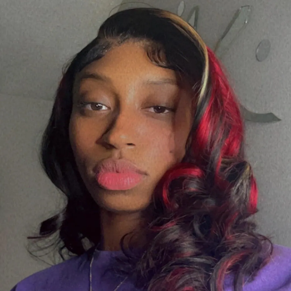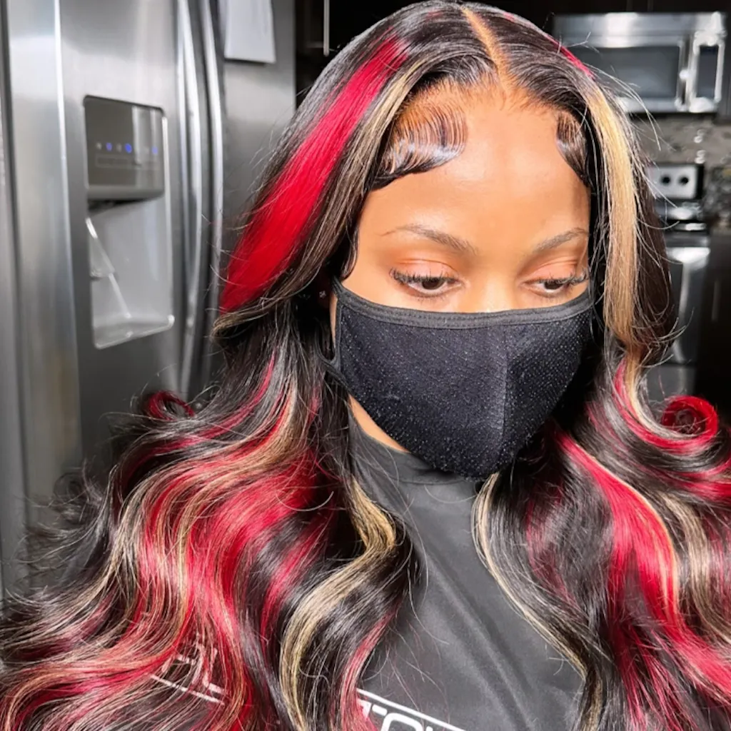 Dircription Dorsanee Black with Red & Blonde Highlights 13x4 Lace Front Red And Blonde Body Wave Wig